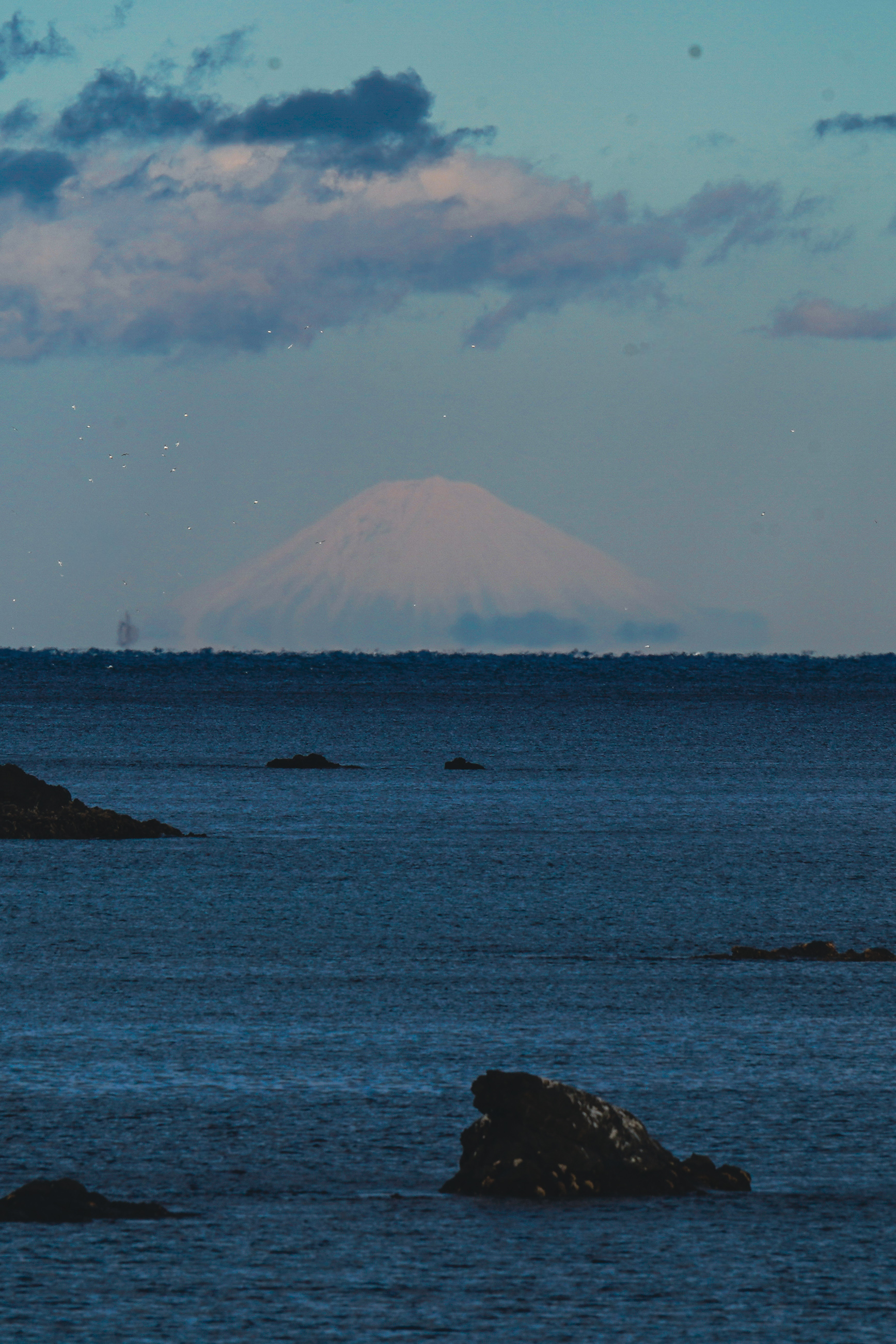 富士山が現れる場所をあらかじめ把握してないと発見しづらいかもしれませんが、早朝などは富士山のシルエットが発見しやすいと思います。ぜひ、相差にお泊りの際は早朝散歩に海辺へ出かけてください。